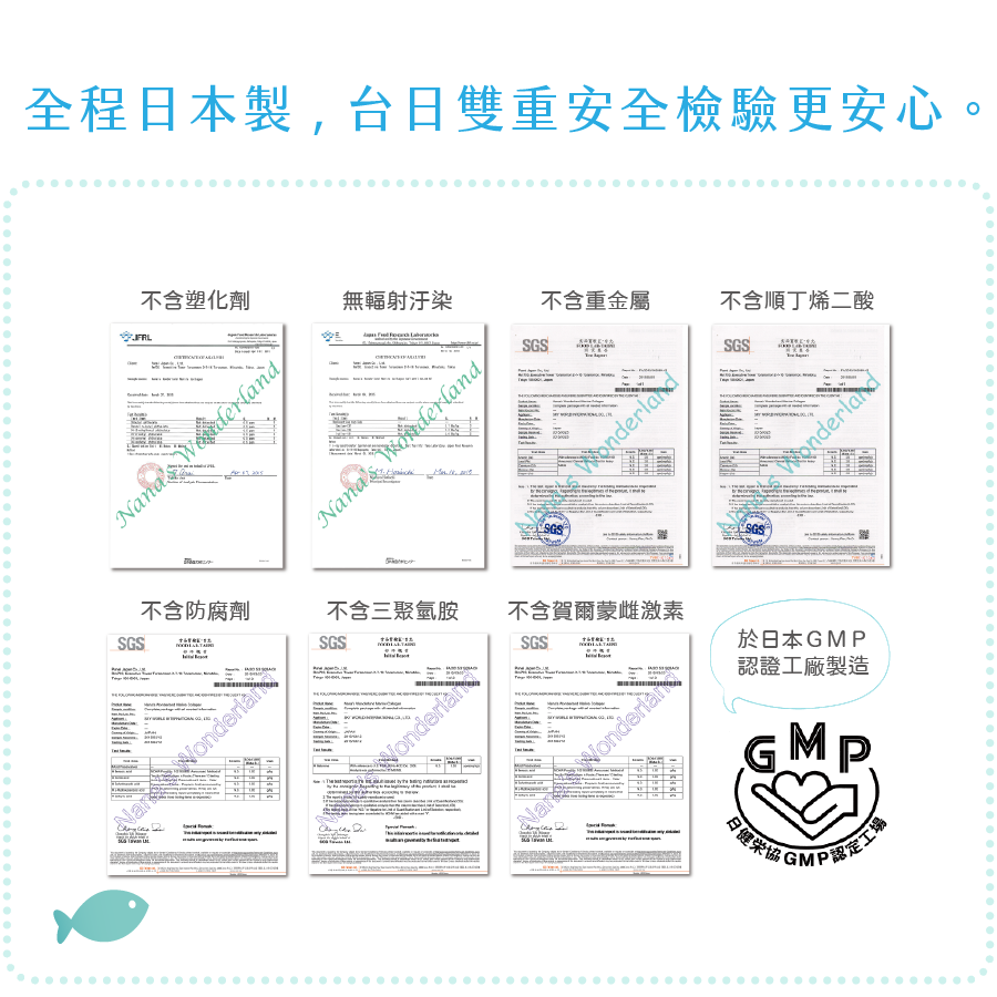 Nana’s Wonderland éclat 永恆璀璨膠原蛋白胜肽承諾提供最高品質的安心產品,經日本食品分析中心JFRL與台灣的SGS認證我們的產品通過各項國家安全標準,敬請放心食用。
