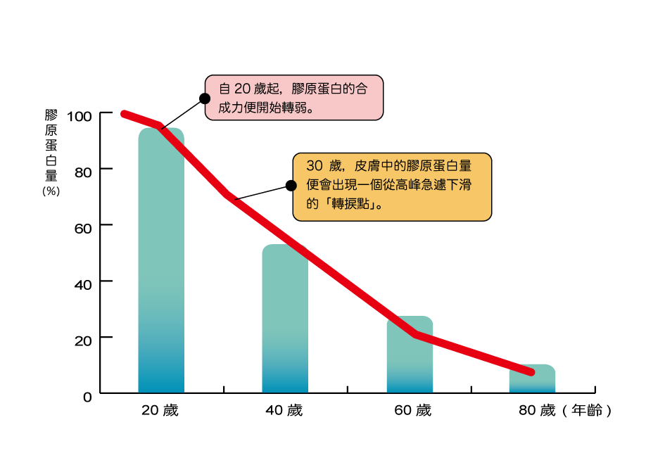 根據研究指出,膠原蛋白在人體內含量在20歲是高峰,之後每年以超過1%以上的速度快速流失自體膠原蛋白。30歲之後流失速度更加快速,眼周肌膚開始出現細紋,皮膚變得鬆垮,這皆是因為膠原蛋白流失所導致。而從25歲35歲之間,人體合成膠原蛋白的能力會下降20%,35歲到45歲則會下降40%,45歲到55歲下降60%。65歲到75歲時,自體合成膠原蛋白的量只有年輕時的20%左右,75歲以上則只剩5~10%。研究也指出,60歲以上的熟齡者的真皮層厚度平均值則較年輕時降低了約25~30%,主要的原因就是因為膠原蛋白含量減少緣故,尤其是女性更加明顯。因此肌膚逐漸失去彈性,出現皺紋、鬆弛等老化現象。