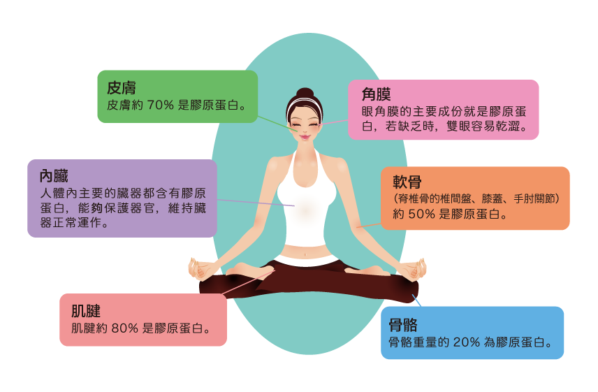 膠原蛋白富含人體需要的甘氨酸、脯氨酸、羥脯氨酸等胺基酸,也是體內含量最多的蛋白質。人體內約有三公斤左右的膠原蛋白,主要存在於人體的皮膚、骨骼、軟骨、韌帶、角膜、牙齒、肌腱、內臟、結締組織等部位,主要的功能是維持皮膚和人體的組織器官的型態與結構,也能夠修復受損組織的重要物質。